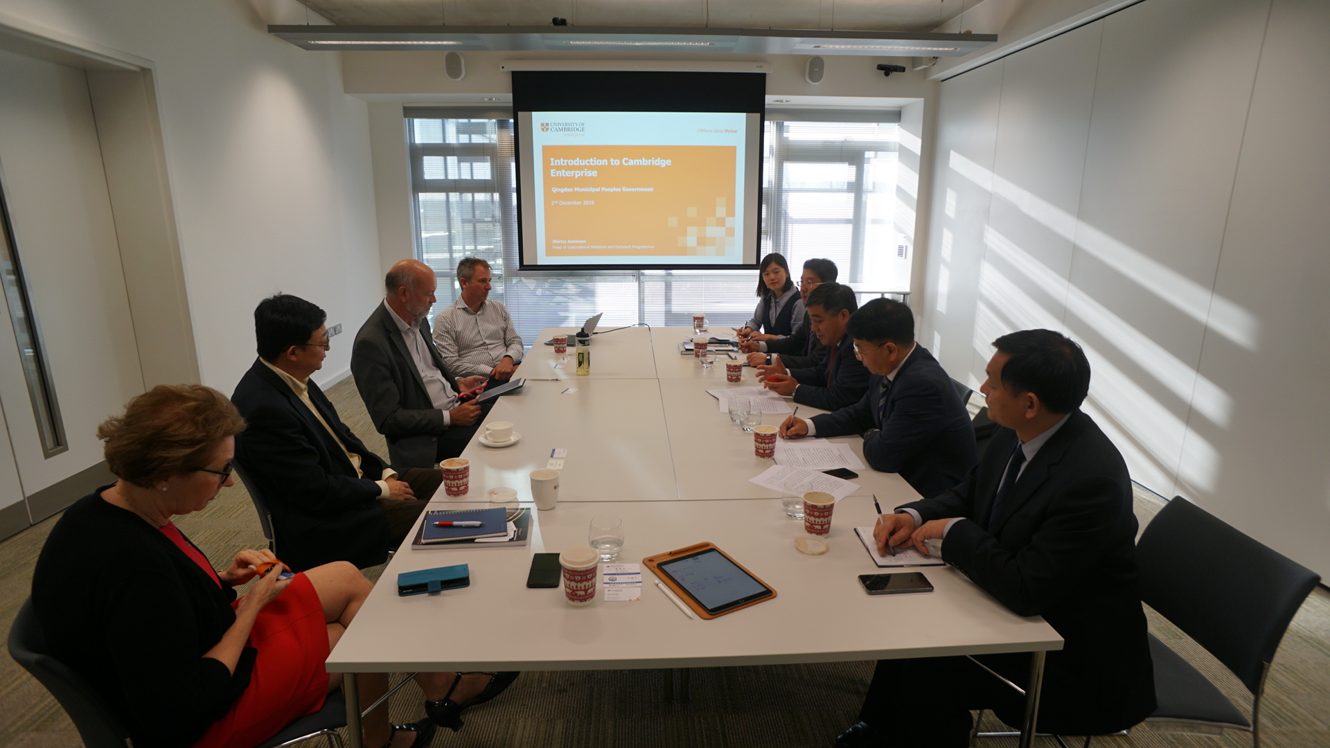 Tony博士及Shirley女士对青岛市代表团到访表示了热烈的欢迎,并介绍了英国剑桥大学及剑桥企业中心在各领域开展的工作及合作模式,重点介绍了剑桥企业中心在面向剑桥大学科研人员科技成果产业化领域提供的商业咨询、技术转让、专利申请、基金投资等方面的专业化服务。