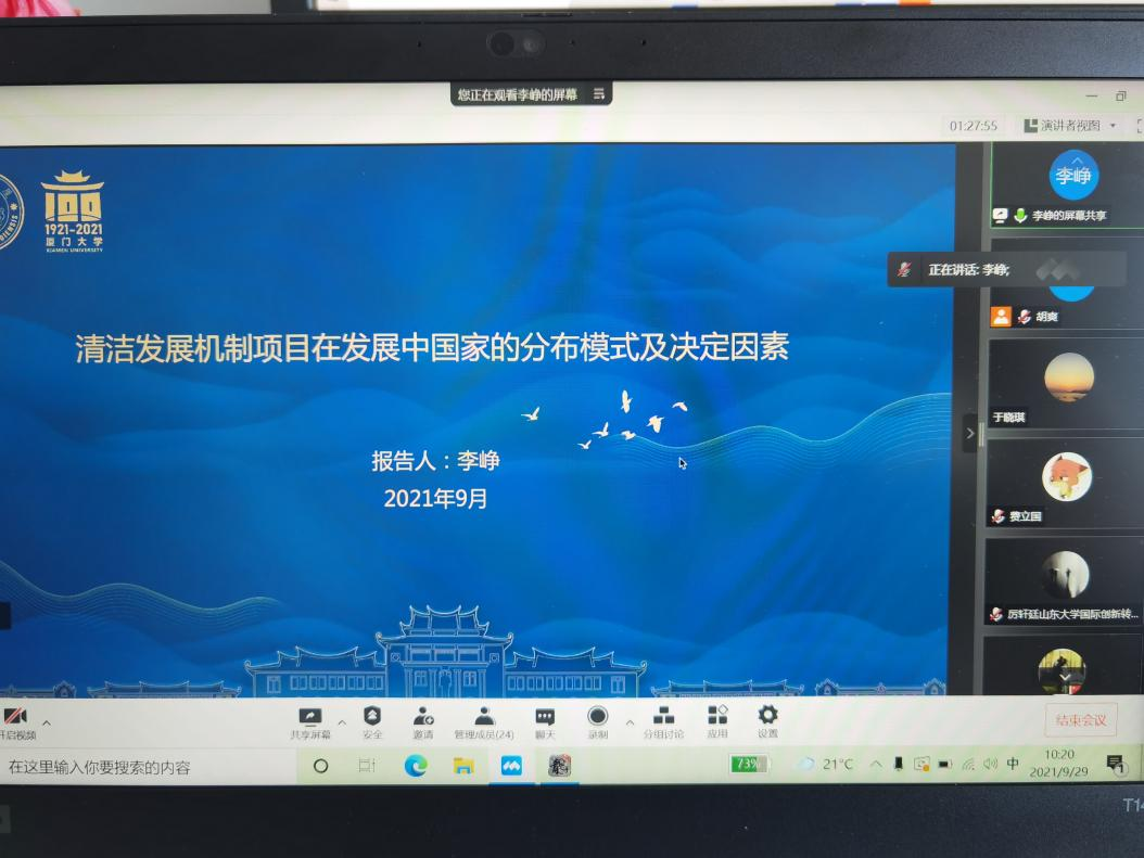 李峥博士以“清洁发展机制项目在发展中国家的分布模式及决定因素”为题作了学术报告。报告围绕清洁发展机制(CDM),分享了清洁发展机制执行局数据库的一些项目,并得出该机制主要分布在风能、光能和海洋能源等可再生能源利用,碳捕获和储存(CCS)技术应用,以及电气化运输和建筑供暖等领域。同时,报告使用面板负二项回归模型分析了清洁发展机制项目分布的决定因素,并得出清洁发展机制未来的发展潜力,以及对低碳发展、技术转化的意义。