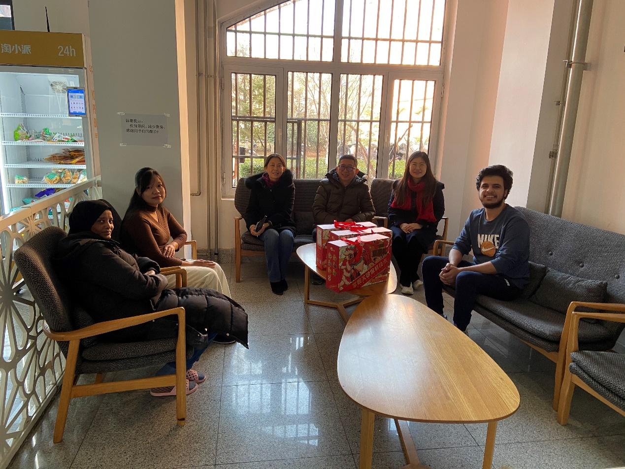 乔岳向留学生赠送了学院精心准备的新春礼包。学院办公室主任郑海涛,副研究员兼留学生辅导员卢翠翠一同参加了看望活动。