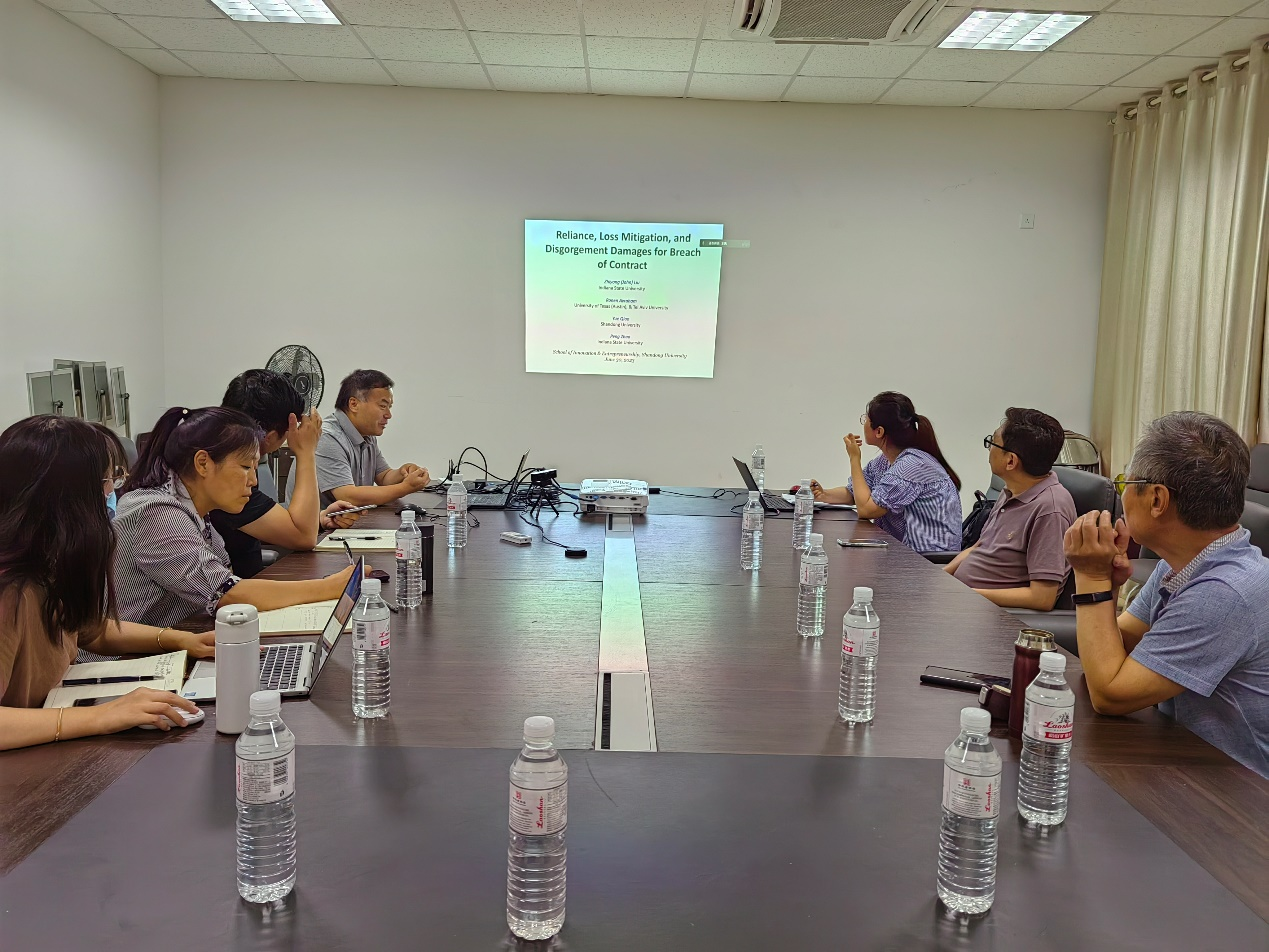 在华岗苑东331会议室举办学术讲座,美国印第安纳州立大学刘智勇教授分享了题为“Reliance, Loss Mitigation, and Disgorgement Damages for Breach of Contract”的相关研究成果。讲座由国产视频