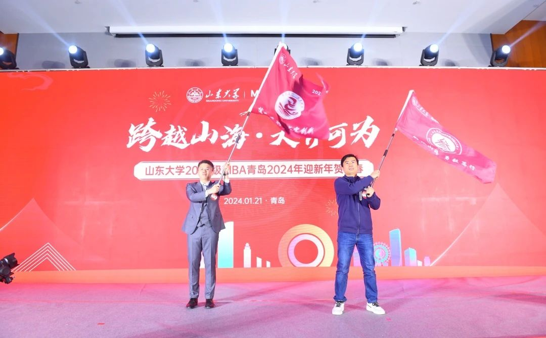 MBA青岛教学点2023级班长李磊和孔祥秋,分别挥动带有各班班徽和班训的班旗绕场展示。“博学笃行,求实创新”和“胸怀山海,勇毅笃行”分别是2班和3班的班训和班级文化,青岛的两个班级也一直在践行团结合作、和而不同、美美与共。伴随着山大的校歌,旗帜舞动,梦想飞扬,山大精神在一级一级的同学心中传递!