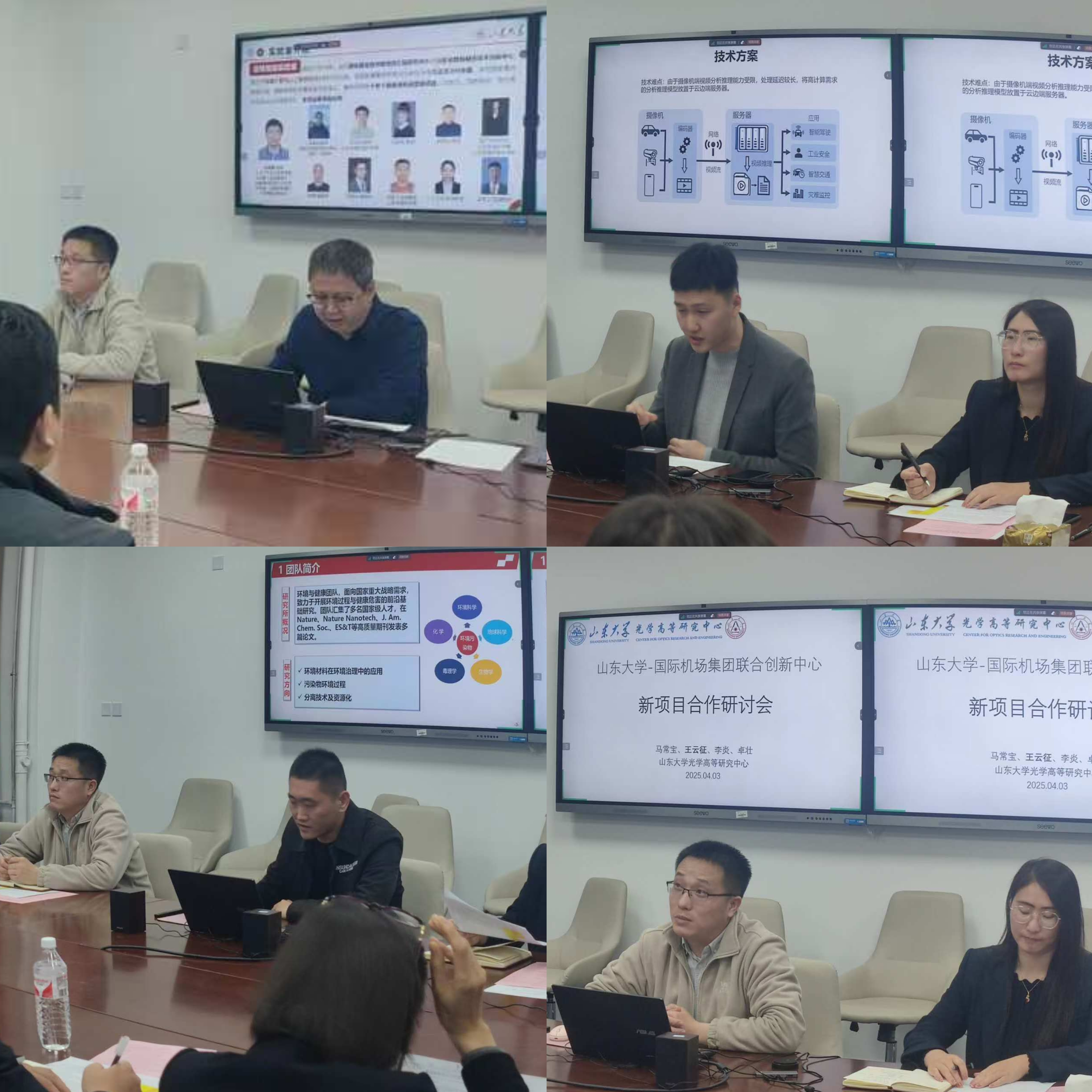 会上,来自计算机学院、环境科学与工程学院、光学高等研究中心的三个科研专家团队,围绕青岛机场集团各部门提出的多个技术需求,分别进行了深入的方案讲解,并与相关部门技术专家展开现场交流。张广辉教授、郑艳伟副研究员围绕飞行区管理部与航空安保部提出的“机场跑道异物探测系统视频分析AI应用”、“违反安全作业行为识别和预警”、“复检系统+AI智能识图在民航安检工作中的应用”、“高精度时空定位系统”等四项需求,分别给出了解决思路。张海光副研究员则就飞行区管理部提出的“机坪除冰及除冰液高效回收”问题进行了详尽的技术回应。最后,王云征研究员针对“光纤传感网络用于机场跑道实时应力监测”、“机场跑道激光除冰”等两项需求,提出了具体的解决方案与优化建议。