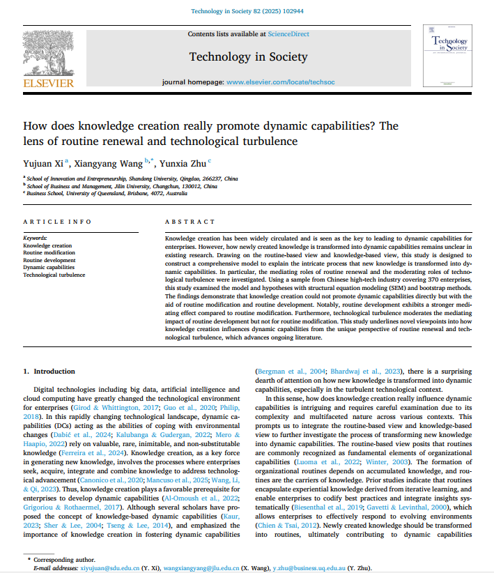 郗玉娟助理研究员与合作者以“How does knowledge creation really promote dynamic capabilities? The lens of routine renewal and technological turbulence”为题的研究论文,在管理学领域期刊《Technology in Society》上发表。该期刊是JCR一区中科院一区Top期刊,最新影响因子为10.1。郗玉娟助理研究员为该论文的第一作者,国产视频