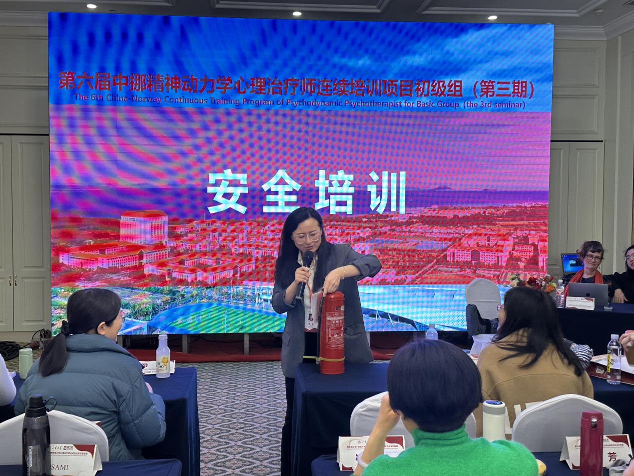 对培训的安全工作高度重视,专门成立中挪培训安全应急工作领导小组对此次培训进行安全督查,制定《第六届中国--挪威精神动力学心理治疗师连续培训项目(初级组)安全应急预案》,对公共卫生事件、食物中毒、火灾、意外伤害、交通事故等主要安全问题作出应急预案,形成快速反应机制。同时向培训合作单位青岛金石国际大酒店、青岛康大豪生大酒店发出安全通知函,对安全办会进行协同。会务组提前到场检查安全通道与安全设施,并在培训开始前,对学员在安全通道的位置、安全设施的分布、消防栓的使用、安全用电等方面进行培训讲解。