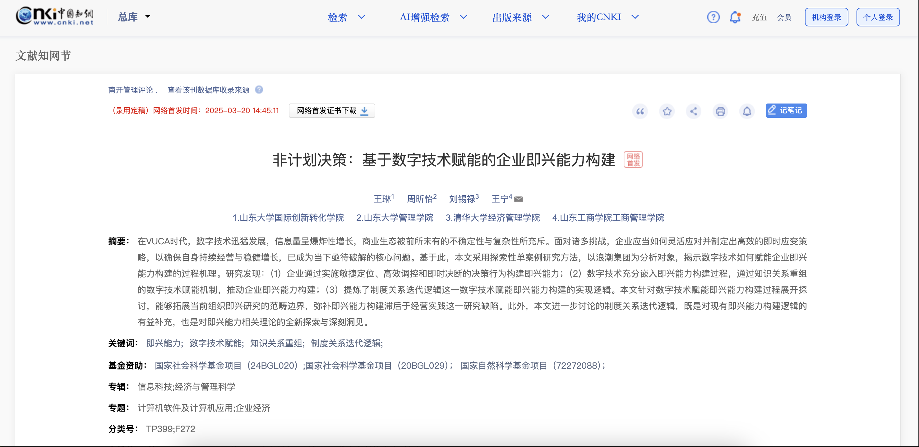 副教授王琳、管理学院硕士研究生周昕怡、清华大学经济管理学院博士后刘锡禄以及山东工商学院工商管理学院副教授王宁在《南开管理评论》期刊(2024年复合影响因子为13.929,期刊综合影响因子为7.263)发表题为《非计划决策:基于数字技术赋能的企业即兴能力构建》的研究论文。王琳副教授为该论文的第一作者,国产视频